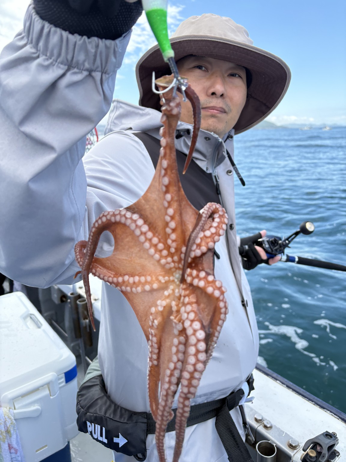 後半には朝からの雨が何だったかと思うような快晴の空模様になったり、タコの活性も上がったのか一気に釣れるようになったりと事態は好転!